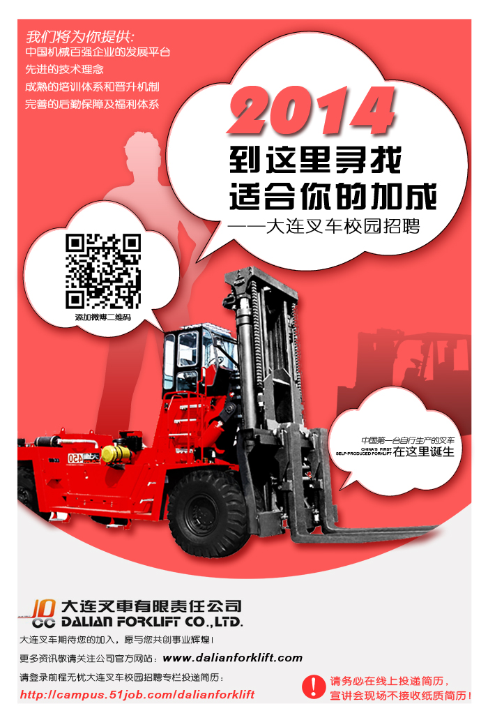大連叉車(chē)2014年校園招聘將于9月16日正式啟幕,本次校園招聘將在大連理工大學(xué)、東北大學(xué)、哈爾濱工程大學(xué)召開(kāi)現(xiàn)場(chǎng)宣講會(huì),誠(chéng)邀莘莘學(xué)子屆時(shí)參加!