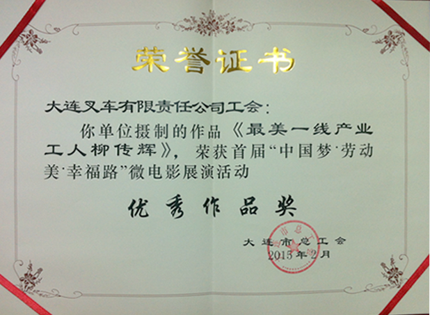 近日,大連市總工會(huì)對于2014年年末舉辦的“中國夢●勞動(dòng)美●幸福路”微電影展演活動(dòng)的評選結(jié)果進(jìn)行了通報(bào),大連叉車有限責(zé)任公司組織拍攝的微電影《最美一線工人柳傳輝》榮獲“優(yōu)秀作品獎(jiǎng)”。