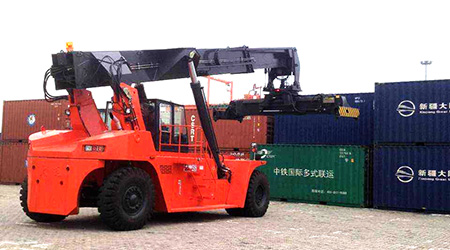 2002年,大連叉車設(shè)計出45噸正面吊運(yùn)機(jī)并投入生產(chǎn),至今已有13年生產(chǎn)開發(fā)史。CRS450Z5型正面吊運(yùn)機(jī)是專門為20英尺和40英尺國際集裝箱設(shè)計的,主要應(yīng)用于集裝箱的堆疊和碼頭、堆場內(nèi)的水平運(yùn)輸,于叉車相比,它具有機(jī)動靈活,操作方便,穩(wěn)定性好的特點(diǎn)。CRS450Z5型正面吊運(yùn)機(jī)特別適用于中小港口,鐵路中轉(zhuǎn)站和公路中轉(zhuǎn)站的集裝箱裝卸,也可在大型集裝箱碼頭作為輔助設(shè)備來使用。整車設(shè)計高標(biāo)準(zhǔn)、高性能,在作業(yè)時可同時實(shí)現(xiàn)整車行走、變幅、臂架伸縮動作,具有較高的工作效率。原裝沃爾沃或康明斯發(fā)動機(jī),燃油消耗低,符合歐Ⅲ排放標(biāo)準(zhǔn),具有全天候易啟動的特點(diǎn),保證車輛發(fā)揮其最大功率和最佳效率。變速箱、驅(qū)動橋、電器系統(tǒng)控制部分和液壓系統(tǒng)工作油泵、液壓閥塊等主要零部件均采用進(jìn)口高端優(yōu)質(zhì)部件,保證產(chǎn)品質(zhì)量,屬具采用進(jìn)口“ELME”型吊具,設(shè)計可使用200萬次以上。今年來該產(chǎn)品已經(jīng)服務(wù)于全國多個地區(qū)的港口碼頭和鐵路系統(tǒng),并且遠(yuǎn)銷海外,深受國外客戶的青睞。