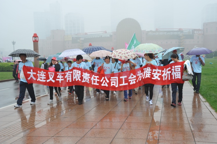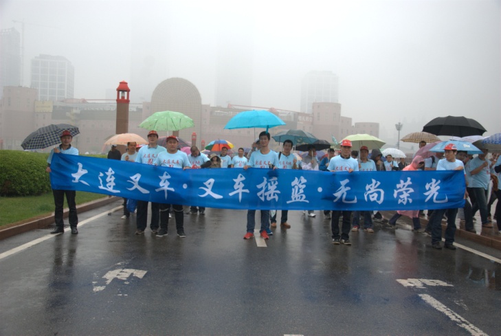本次徒步大會(huì)仍以“健康、和平、交流”為主題,在輕松愉快的徒步過程中,可以收獲健康、傳遞和平,增進(jìn)交流;可以放松精神,愉悅身心,溝通情感。“大連叉車與世界同行、大連叉車向全市人民問好、大連叉車,叉車搖籃,無尚榮光、大連叉車工會(huì)為雅安祈福”的大型條幅以及“大連叉車與您共贏、大連叉車與您同行”的小橫幅在細(xì)雨中格外醒目,引來眾多徒步愛好者和攝影愛好者的目光,四面藍(lán)色的廠旗和15面彩色的支會(huì)旗迎風(fēng)飄揚(yáng),展示著大連叉車朝氣蓬勃的精神風(fēng)貌, 大叉隊(duì)伍似一條長(zhǎng)龍,蜿蜒在星海灣徒步大會(huì)主會(huì)場(chǎng),隊(duì)伍中的每個(gè)人都昂首挺胸、精神抖擻,無時(shí)無刻不展示著作為一名大叉人的那份榮耀和自豪。